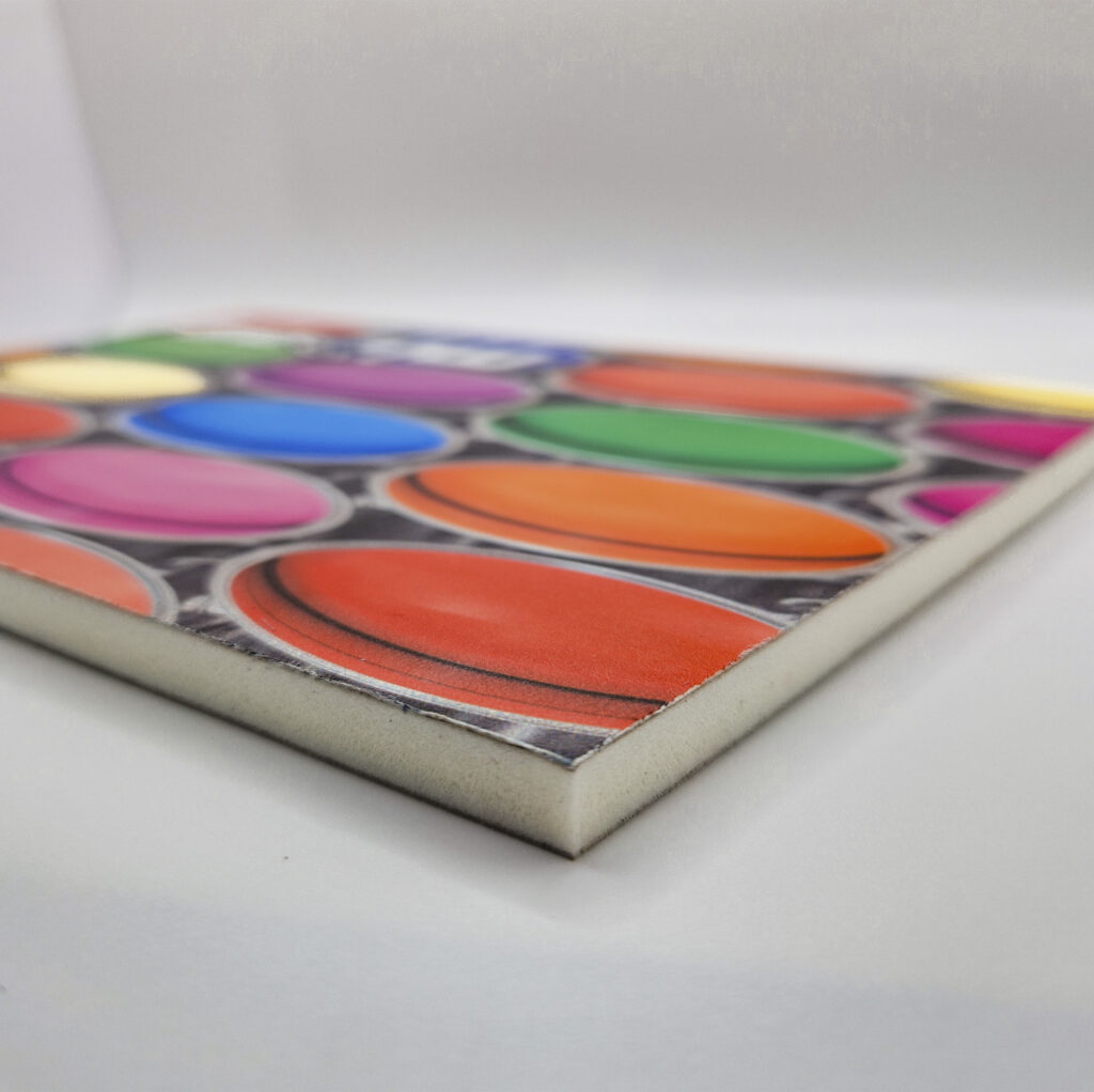 Su superficie es de papel estucado blanco pigmentado de alta calidad que junto con la impresión directa con tintas UV se evita que la misma penetre en el papel consiguiendo colores vivos, dotando a la imagen de mayor saturación de color lo que permite una mayor profundidad de la imagen.
