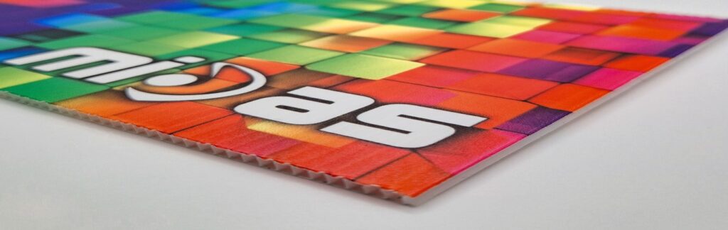 Impresión digital directa sobre polipropileno celular en tinta UVI, material ligero y resistente, apropiado para exterior. Compuesto por una estructura acanalada permite la colocación de ollados para su fácil colocación, muy utilizado para inmobiliarias. Disponible en 3mm de grosor. Las dimensiones máximas de una sola plancha son 300 x 200 cm